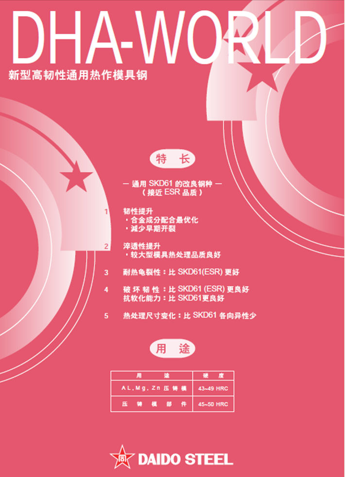 簡要描述:日本大同DHA-WORLD熱作模具鋼:高韌性*高淬透性通用熱作模具鋼...