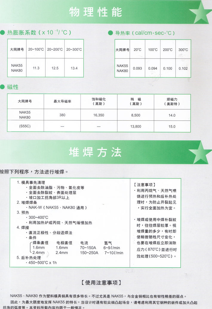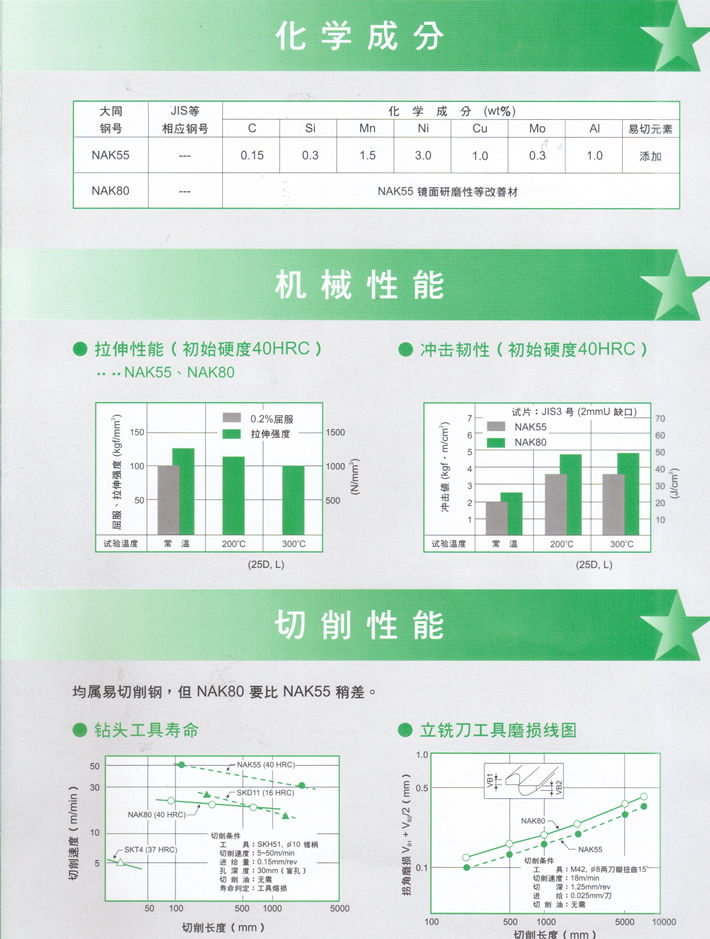 簡(jiǎn)要描述:日本大同NAK80/NAK55(高鏡面模具鋼): NAK55:易切削型40HRC級(jí)預(yù)硬鋼 NAK80:高鏡面型40HRC級(jí)預(yù)硬鋼...