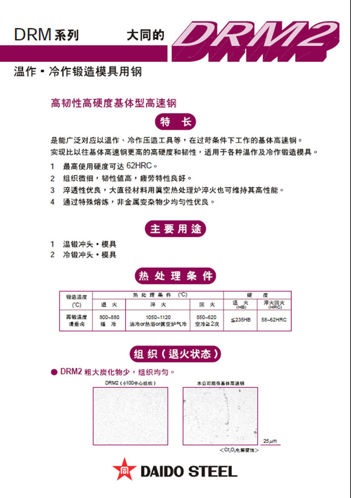 簡要描述:日本大同DRM2高速鋼:高硬度高韌性,主要用于溫作鍛造。...